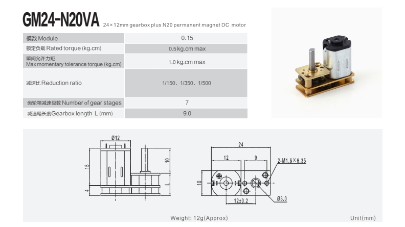 24×12mm gearbox plus N20 permanent magnet DC motor